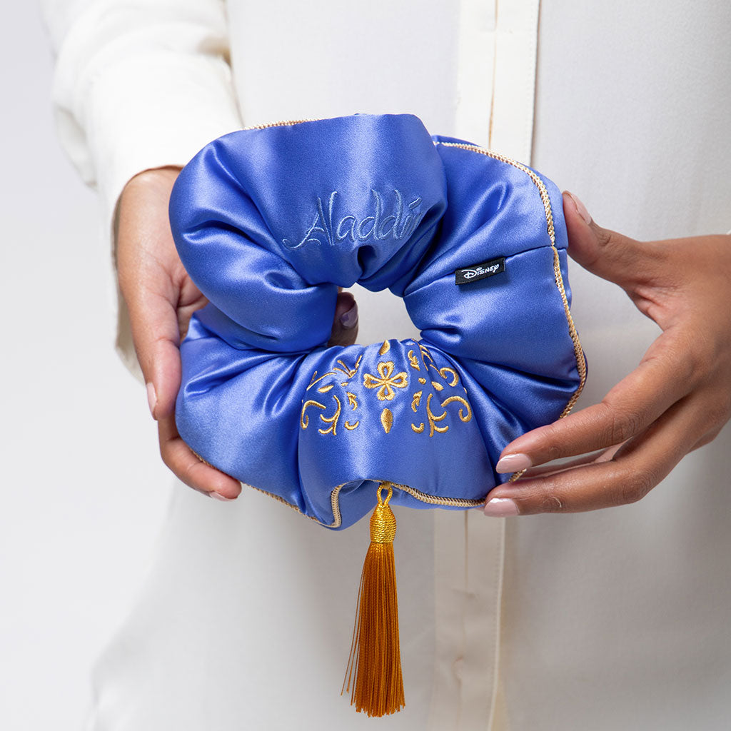 Discover a whole new world of beauty. Elevate your style with this Magic Carpet-inspired silk scrunchie. Its unique oversized design cocoons your hair, preventing it from snagging during the night. With this little touch of magic wrapped around your hair, you’ll glow like a princess.